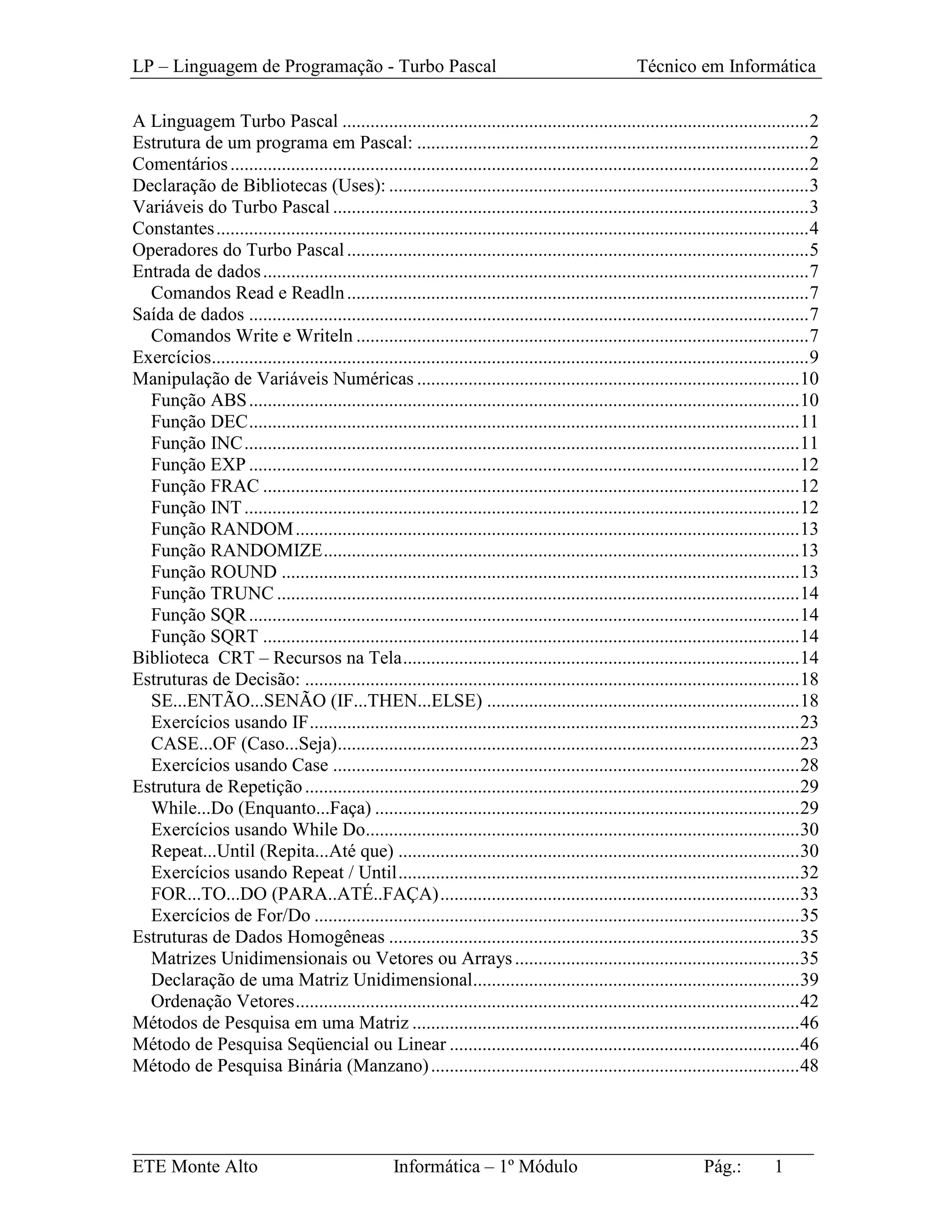 Este documento descreve as principais características da linguagem de programação Turbo Pascal, incluindo sua estrutura básica, variáveis, constantes, operadores, entrada e saída de dados, estruturas de decisão e repetição, e funções matemáticas. O documento fornece exemplos de código para ilustrar cada um desses tópicos e exercícios para teste do leitor.