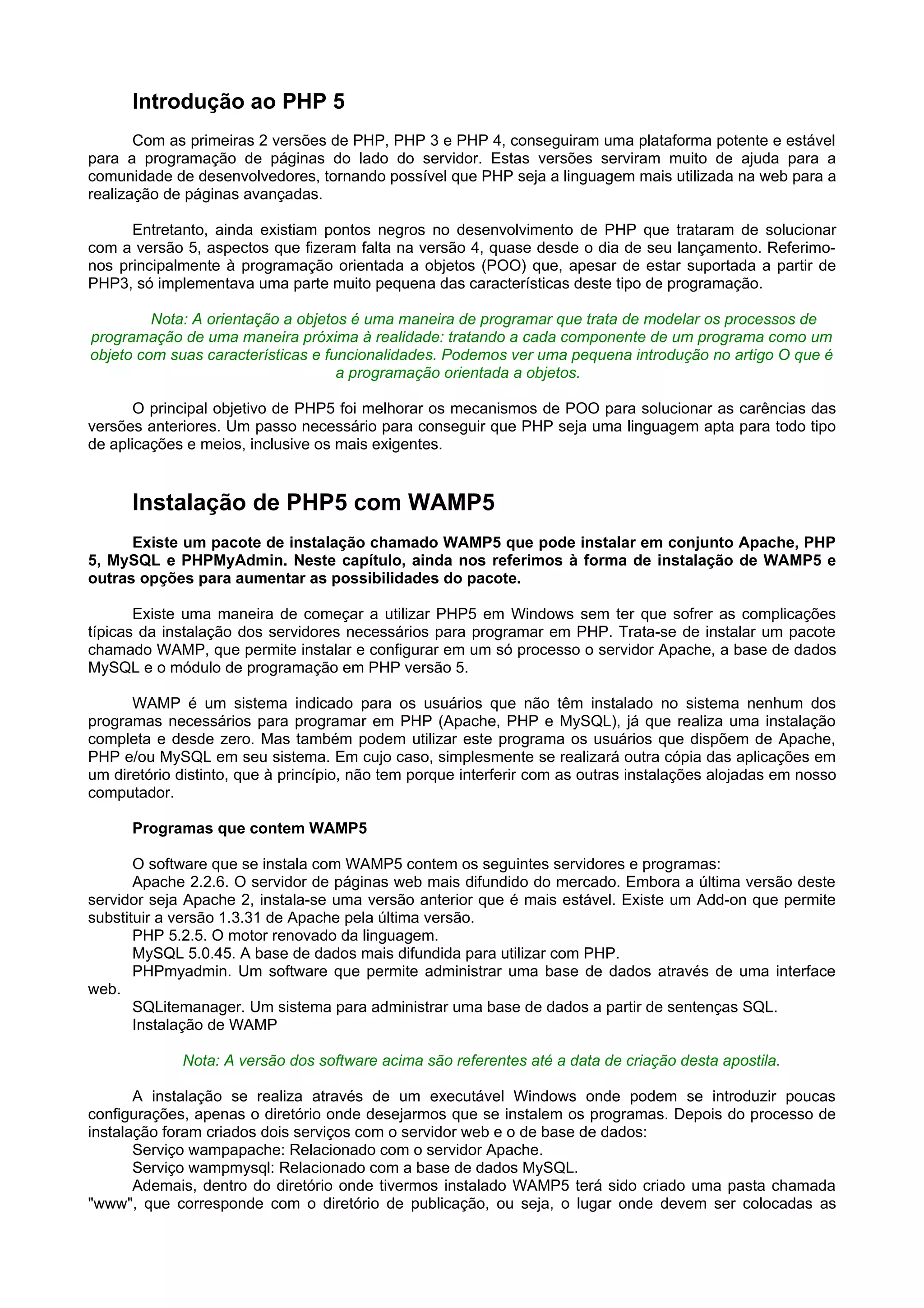 1) O documento introduz o PHP 5 e suas melhorias na programação orientada a objetos em relação às versões anteriores. 2) O WAMP é um pacote que facilita a instalação dos servidores necessários para usar PHP 5 como Apache, MySQL e PHP. 3) PHP 5 introduz novos recursos de orientação a objetos como métodos construtores e destrutores, modificadores de acesso, interfaces e mais.
