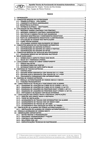 Este documento fornece instruções sobre o funcionamento de acessórios automotivos e sobre como usar um multímetro para medir tensão, corrente, resistência e outros sinais elétricos. Inclui conceitos básicos de eletricidade, instruções sobre sistemas de travas, alarmes, vidros elétricos e módulos de automação para veículos.