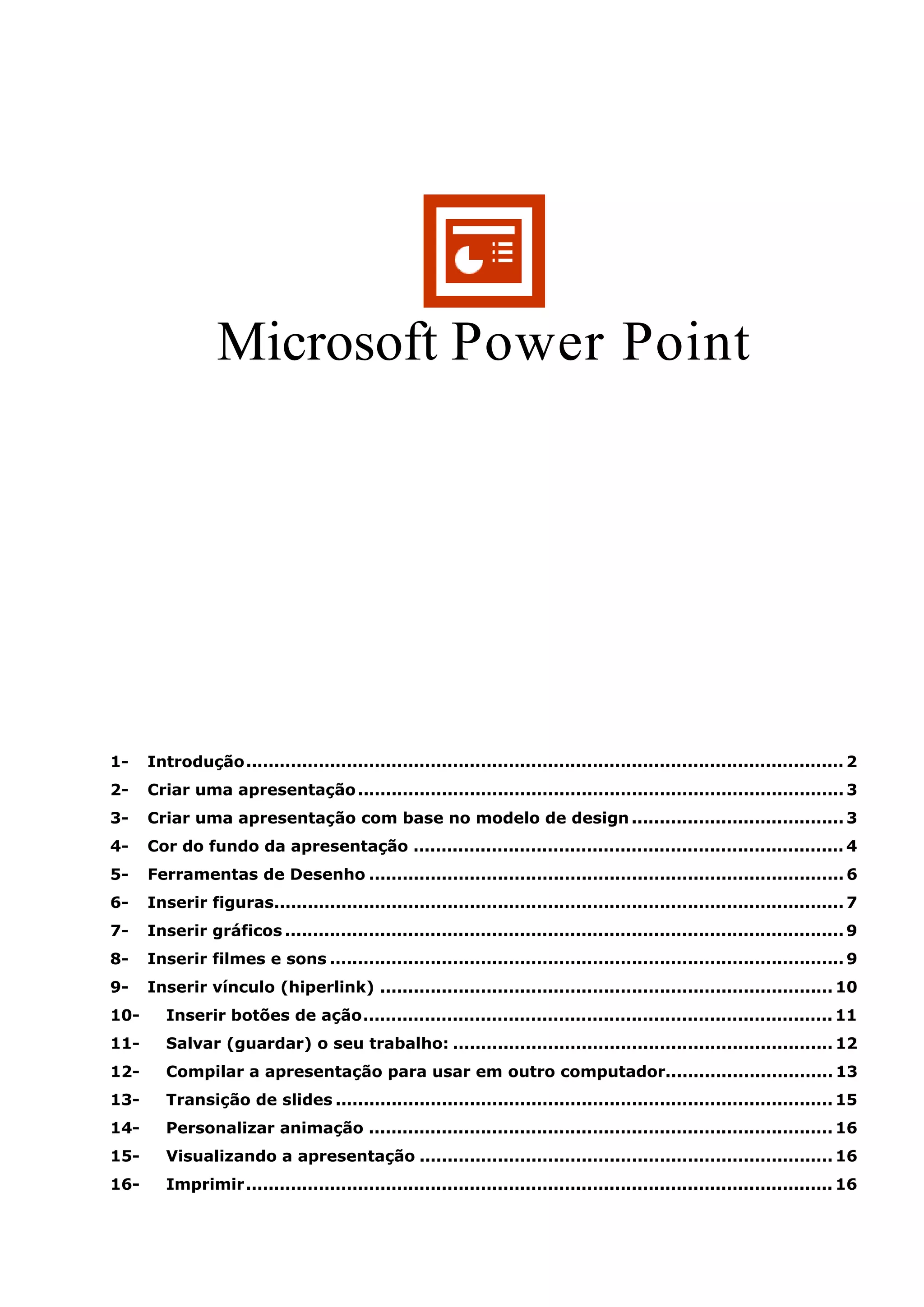 Este documento fornece instruções sobre como usar o Microsoft PowerPoint. Ele explica como criar uma apresentação, adicionar slides de modelo de design, alterar a cor de fundo, usar ferramentas de desenho, inserir figuras, gráficos, vídeos e sons, hiperlinks, botões de ação, salvar, compilar para outros computadores, transições, animações, visualizar e imprimir a apresentação.