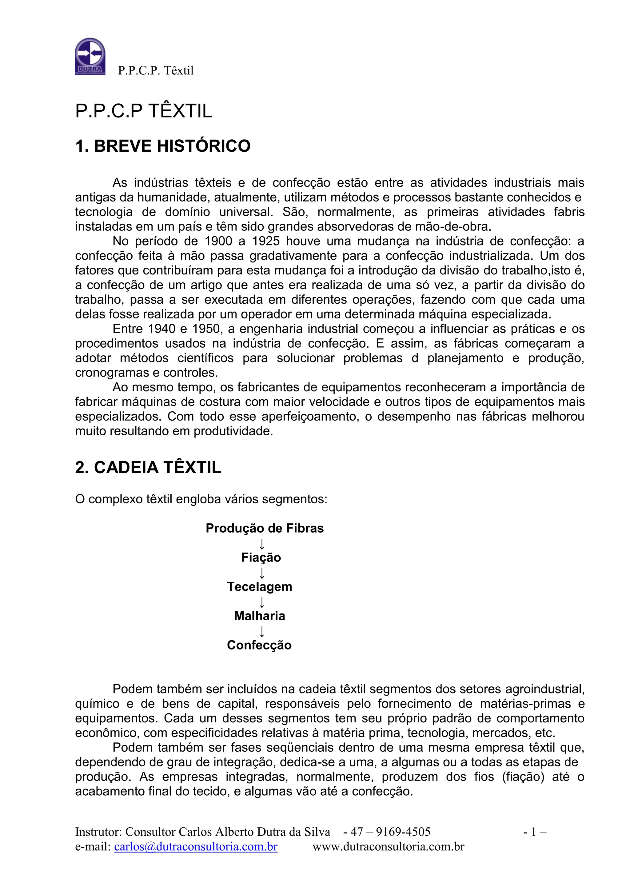 O documento fornece um resumo da indústria têxtil e de confecção, incluindo uma breve história do setor, a cadeia produtiva têxtil, as etapas de construção e reprodução de roupas, e os setores operacionais de corte e costura.