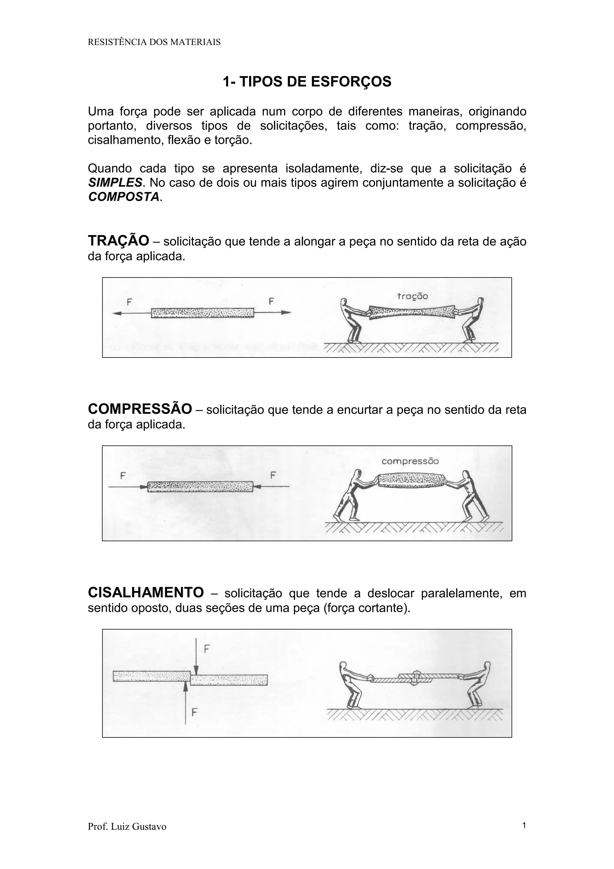 O documento apresenta os principais tipos de esforços mecânicos que podem ser aplicados em materiais, incluindo tração, compressão, cisalhamento, flexão e torção. Também descreve os conceitos de deformação elástica e plástica, módulo de elasticidade, diagrama tensão-deformação, propriedades mecânicas de diferentes materiais e dimensionamento de peças considerando tensões admissíveis.