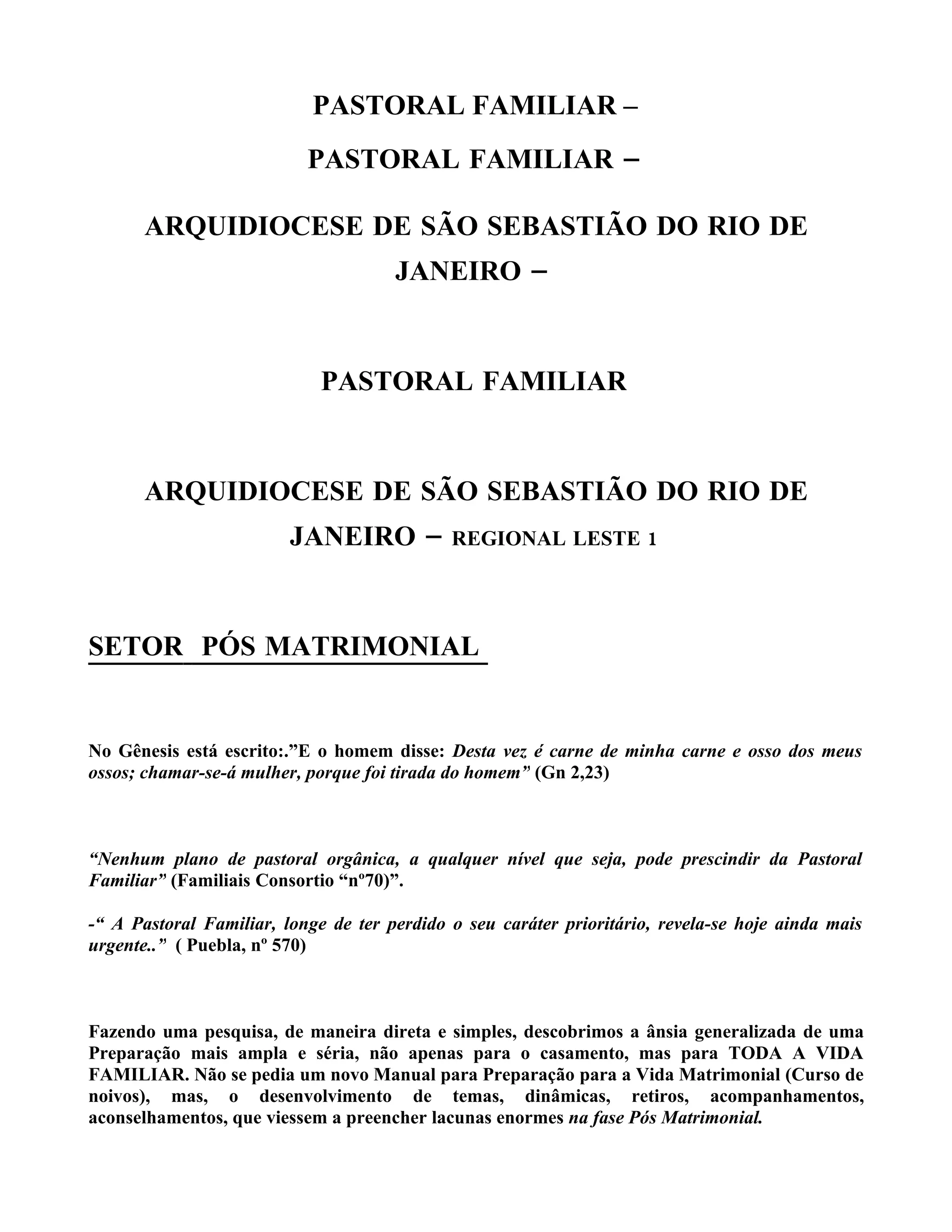 O documento discute a importância da Pastoral Familiar na Arquidiocese de São Sebastião do Rio de Janeiro. Ele destaca a necessidade de preparação para toda a vida familiar, não apenas para o casamento. O texto também fornece sugestões para o trabalho com recém-casados, incluindo temas e dinâmicas para reuniões de reflexão. Por fim, discute a importância do envolvimento dos pais no batismo, catequese e crisma de seus filhos.