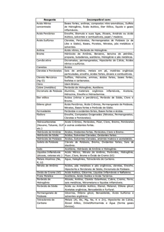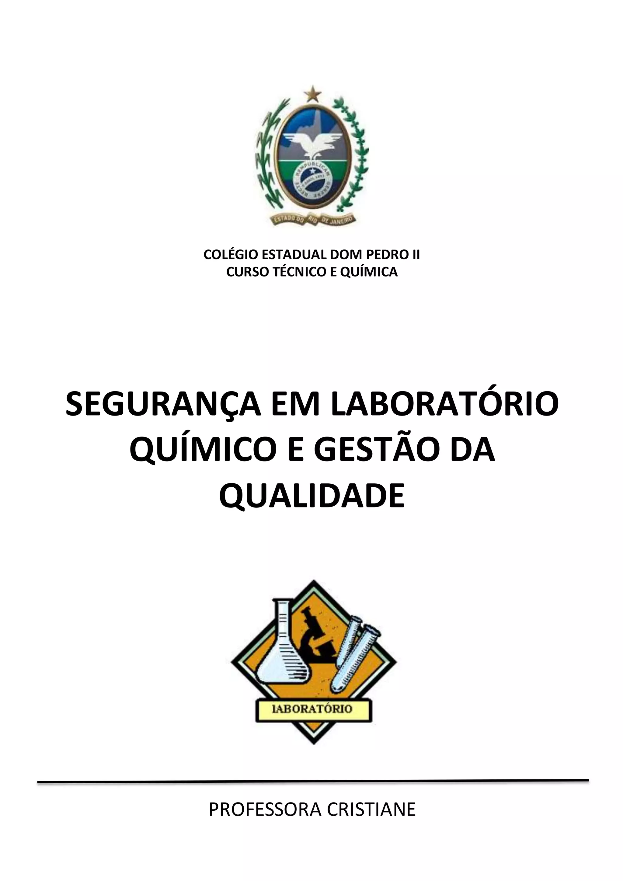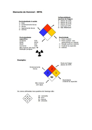 O documento discute segurança em laboratórios químicos, abordando tópicos como acidentes e intoxicações, vias de exposição a agentes químicos, equipamentos de proteção coletiva e individual, armazenamento seguro de produtos químicos, incêndios e descarte adequado de resíduos.