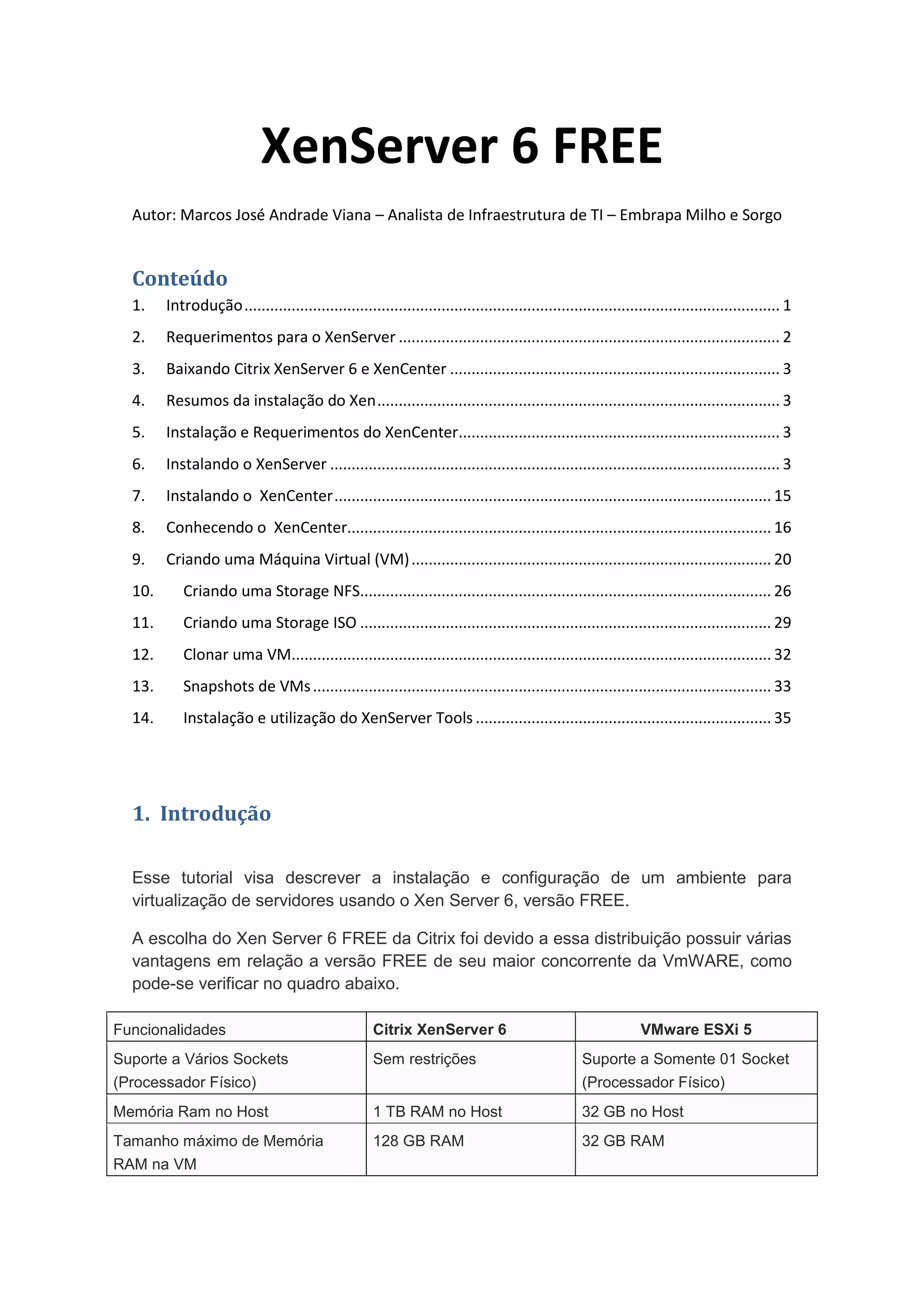 O documento é um guia de instalação e configuração do Citrix XenServer 6, mostrando suas vantagens sobre concorrentes, requisitos de hardware e etapas detalhadas de instalação do XenServer e do XenCenter. O conteúdo aborda desde a criação de máquinas virtuais até a configuração de storage NFS e ISO, detalhando como gerenciar um ambiente de virtualização. Este tutorial é útil para analistas de infraestrutura que desejam implementar virtualização de servidores.