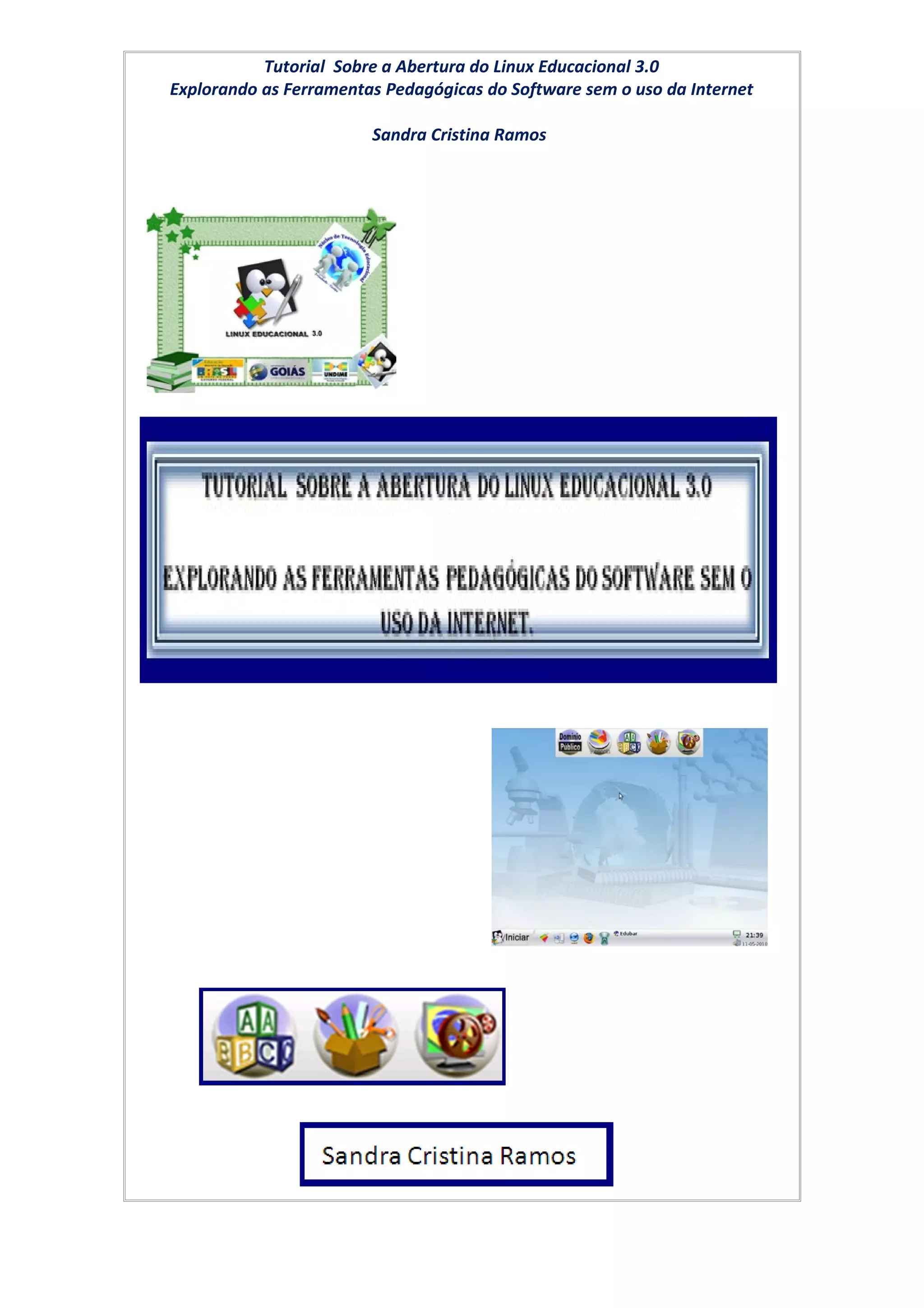 1. O documento apresenta Sandra Cristina Ramos e descreve seu tutorial sobre a abertura e ferramentas pedagógicas do Linux Educacional 3.0 sem uso da internet.
