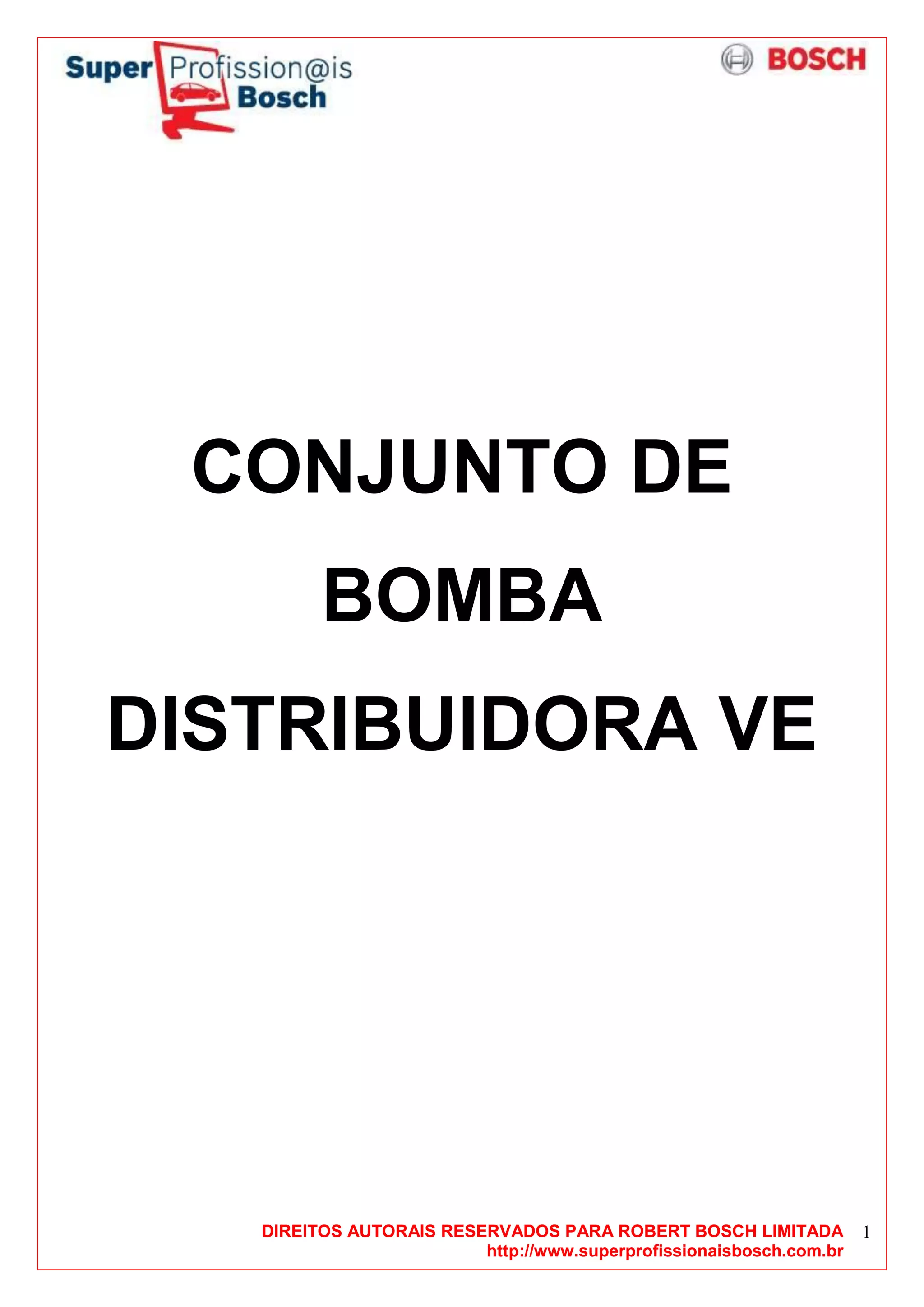 O documento descreve os componentes e funcionamento da bomba distribuidora VE, incluindo sua história, funções, características e processos internos. É dividido em seções sobre introdução, componentes, funcionamento do sistema e seus componentes internos.