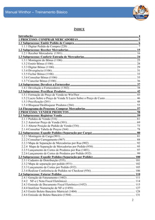 O manual apresenta os principais subprocessos do processo de comprar mercadorias no sistema Winthor, sendo eles: (1) emitir pedido de compra, (2) receber mercadorias, (3) conferir entrada de mercadorias, (4) devolver a fornecedor e (5) precificar produtos. O primeiro subprocesso detalhado é emitir pedido de compra, onde são explicados os passos para lançar um pedido de compra no sistema, definindo suas condições comerciais como preço, desconto, impostos e quantidade a ser adquirida.