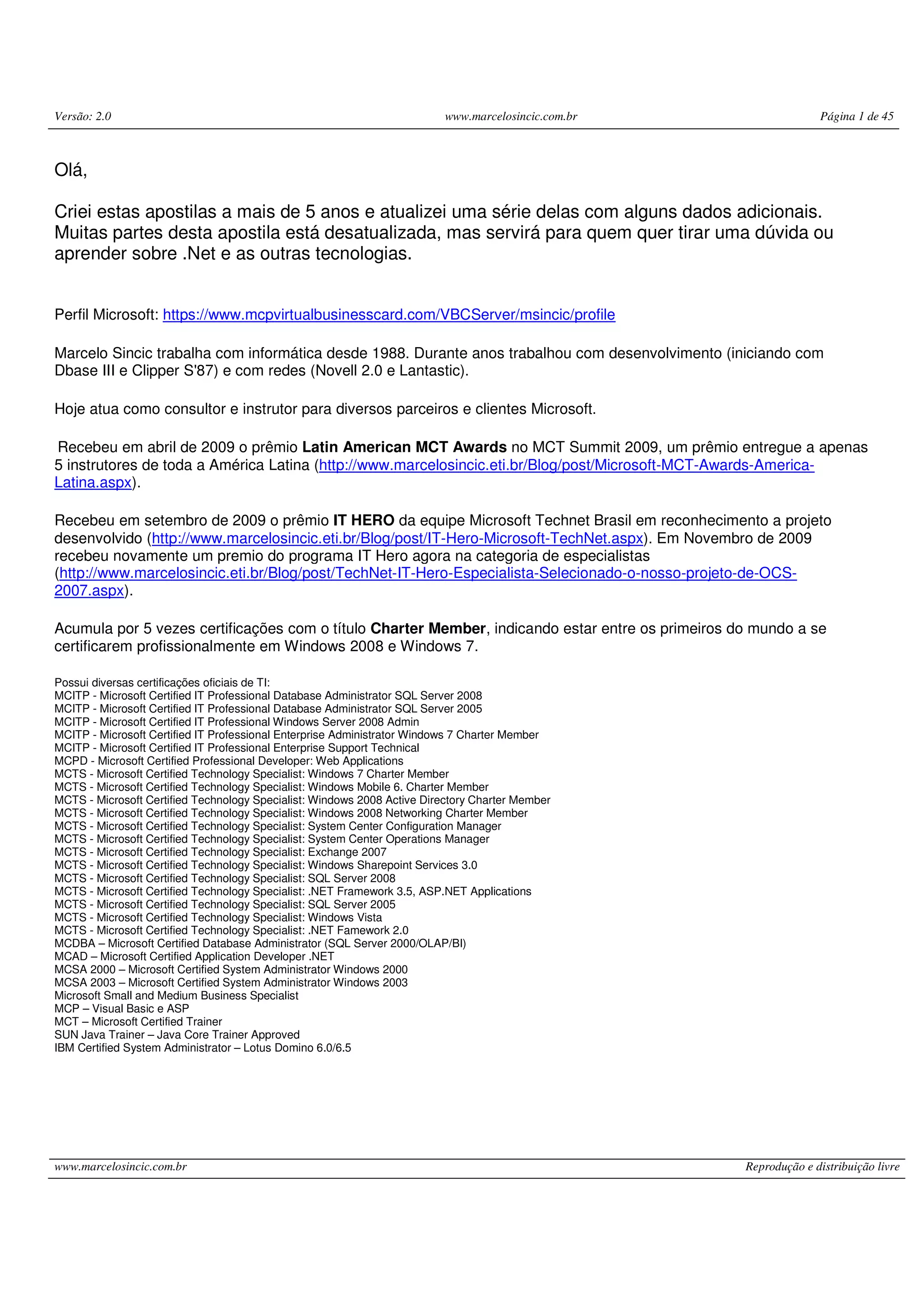 Este documento fornece uma visão geral do Visual Basic .NET, incluindo conceitos básicos de codificação, projetos, classes, formulários, controles, depuração e compilação. Ele também discute tópicos como manipulação de variáveis, instruções condicionais, laços, tratamento de erros, métodos, arrays, classes do .NET Framework, herança, polimorfismo, namespaces e eventos.