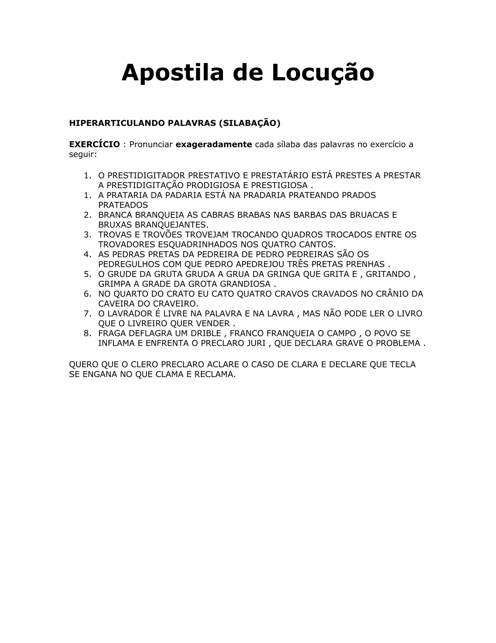 O documento fornece dicas sobre técnicas de locução, incluindo exercícios de silabação, respiração, tipos de vozes e leitura de textos. Aborda tópicos como identificar palavras-chave, variar o tom entre parágrafos e dominar a respiração para melhor controle vocal.