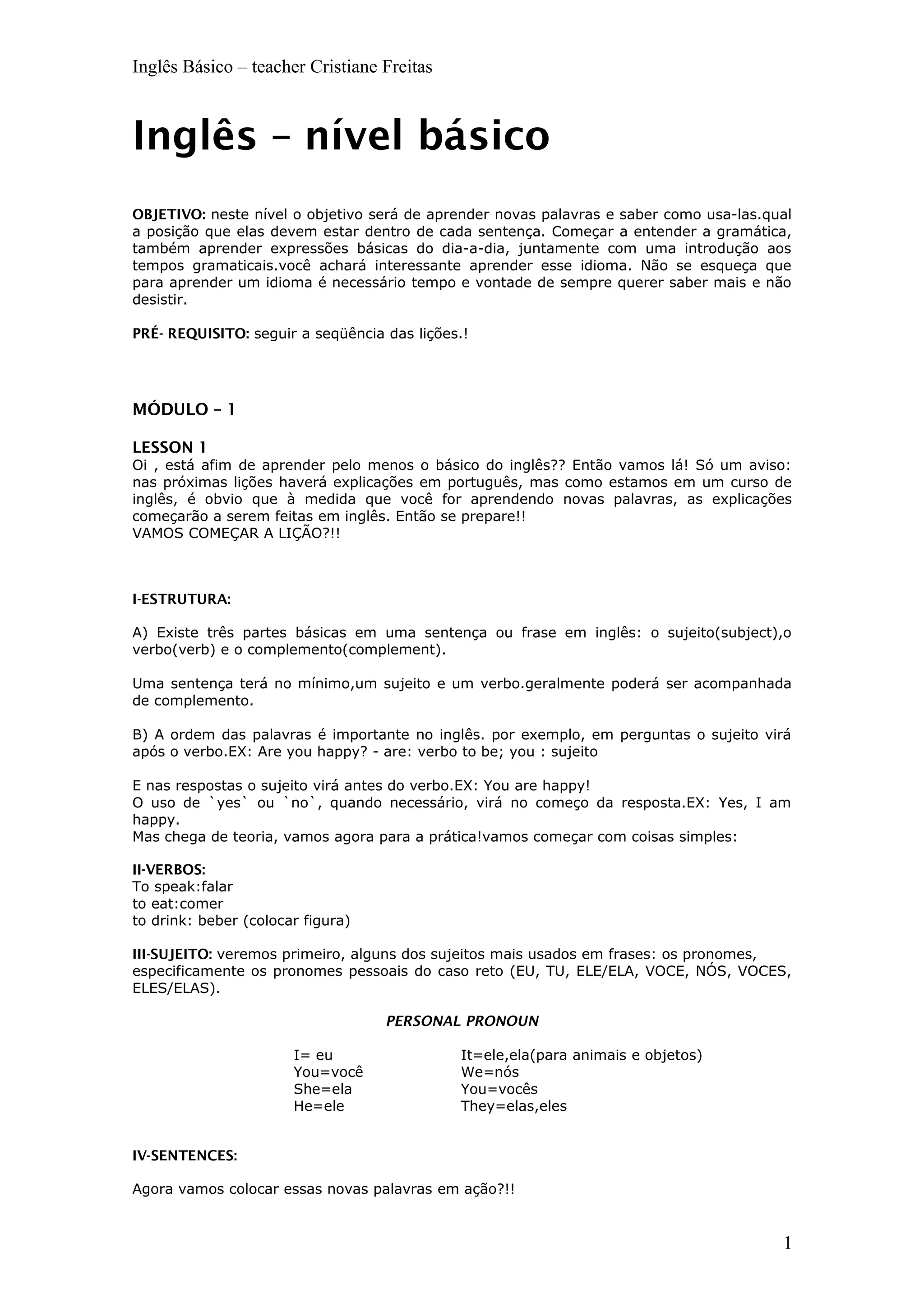 Este documento fornece instruções para uma aula de nível básico de inglês. Ele apresenta novas palavras e estruturas gramaticais, como sujeito, verbo e complemento em frases. Também ensina sobre pronomes pessoais, tempos verbais e expressões comuns. Exercícios práticos são fornecidos para reforçar a compreensão.