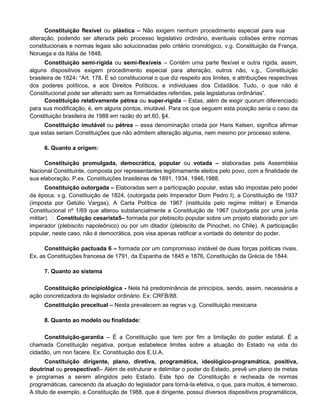 1) O documento discute as classificações das constituições de acordo com vários critérios como conteúdo, forma, modo de elaboração, objetivo, estabilidade, origem, sistema, modelo, tamanho, dogmática e correspondência com a realidade política.