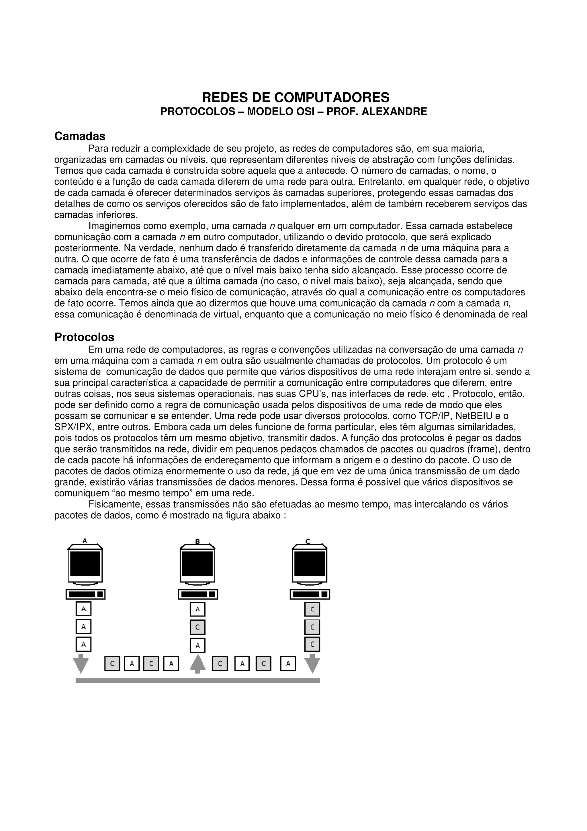 O documento descreve as camadas do modelo OSI, incluindo suas funções. Cada camada fornece serviços à camada acima e recebe serviços da camada abaixo, com a camada mais baixa interagindo diretamente com o meio físico. O modelo OSI divide o problema da comunicação em sete camadas, cada uma resolvendo um aspecto específico da transmissão de dados entre sistemas.