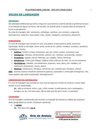 O documento define e explica diversos vícios de linguagem como barbarismo, ambiguidade, cacofonia, estrangeirismo e pleonasmo. Fornece exemplos de cada um destes vícios e explica como eles afetam negativamente a língua portuguesa.