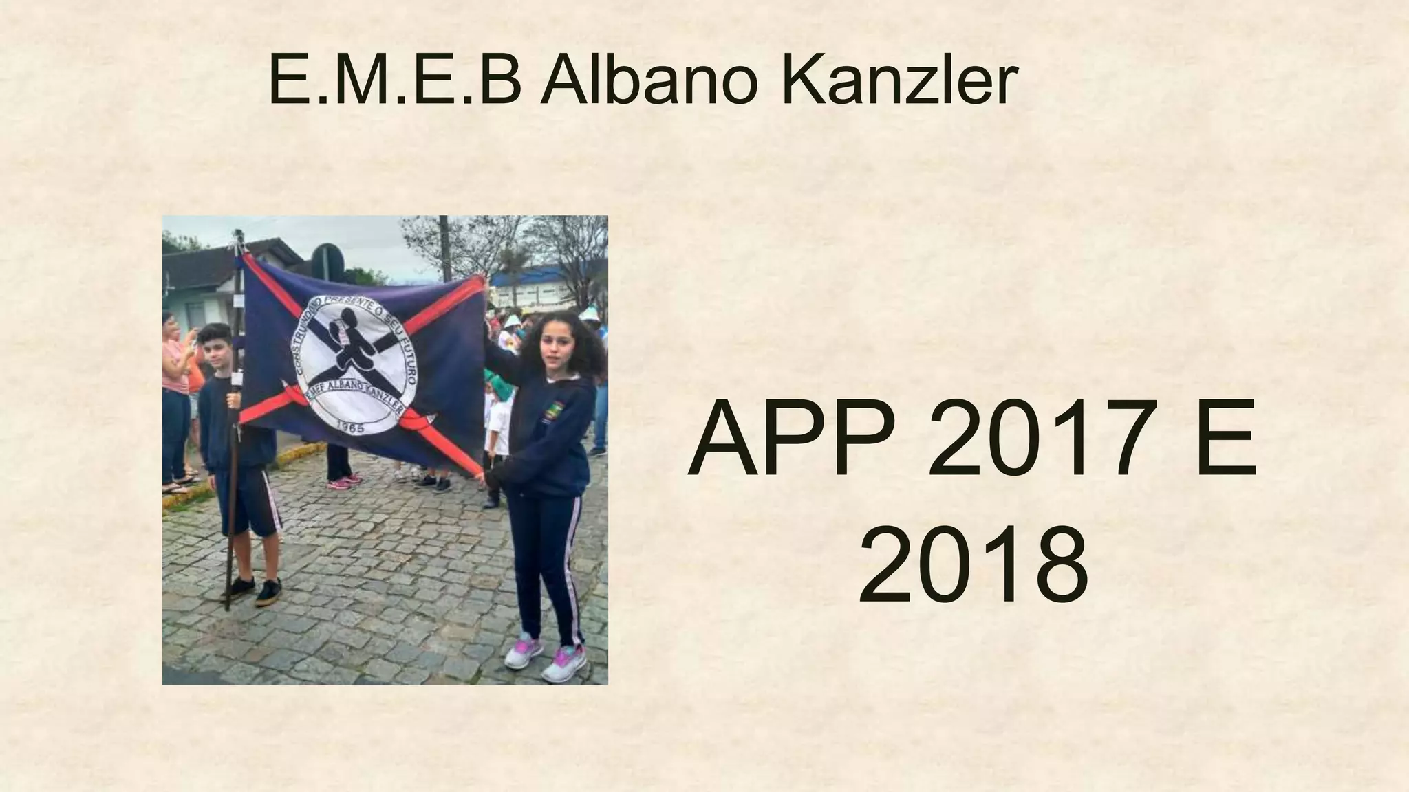 O documento detalha os projetos realizados na EMEB Albano Kanzler em 2017 e 2018 através da APP, incluindo a aquisição de um notebook, prateleiras para a cozinha, doação de tinta, compra de materiais para a sala de música e livros para a biblioteca, reparos após depredação, compra de lavadora e tanque para educação infantil, projetor, mesa e monitor para salas de aula e pintura das salas de aula.