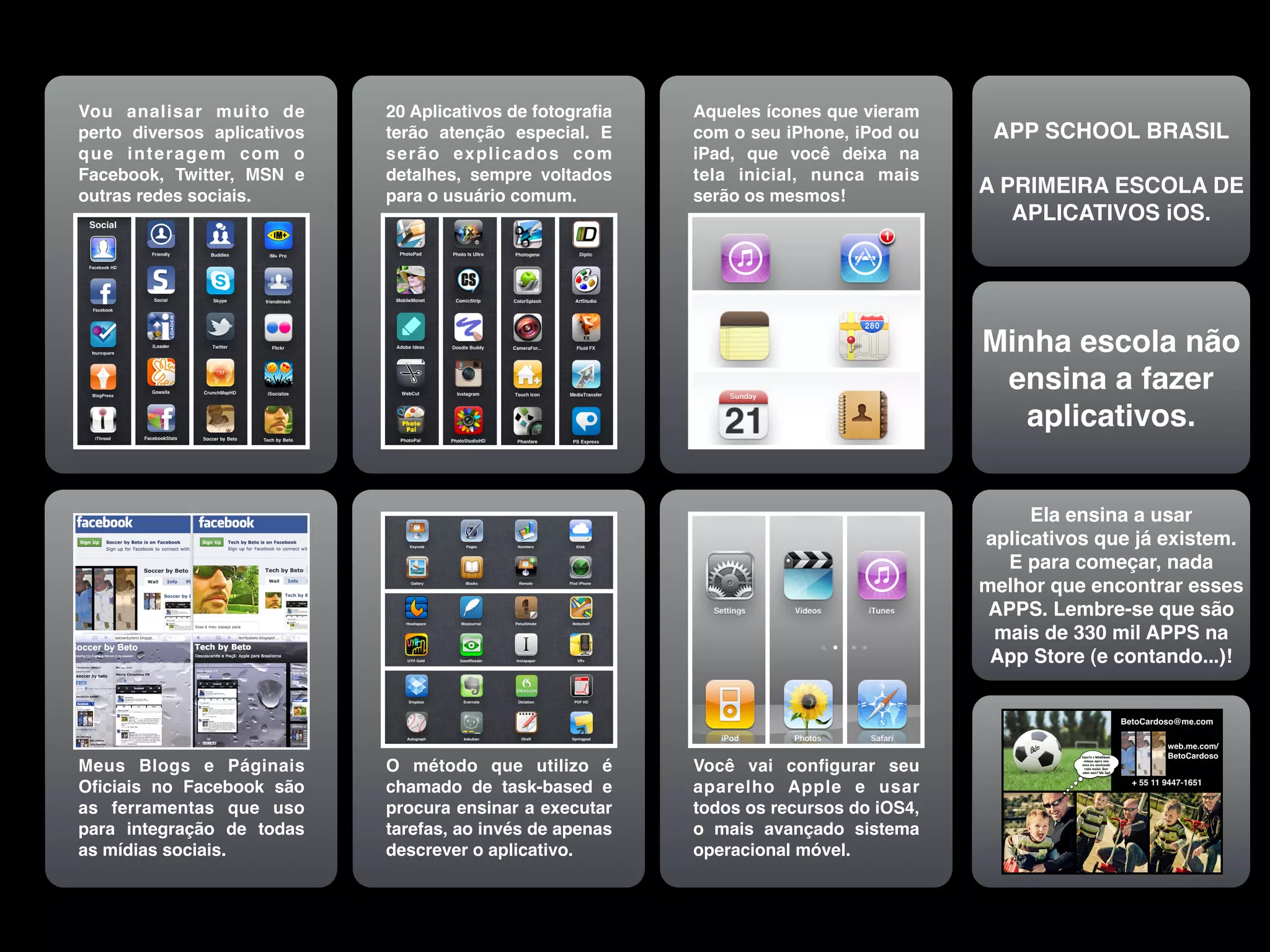 O documento discute vários aplicativos de fotografia e redes sociais que interagem com o Facebook, Twitter e outras plataformas. O autor analisará esses aplicativos com detalhes voltados para usuários comuns, explicando-os com seu método de ensino baseado em tarefas. O leitor aprenderá a configurar e usar recursos de aparelhos Apple com o sistema iOS4.