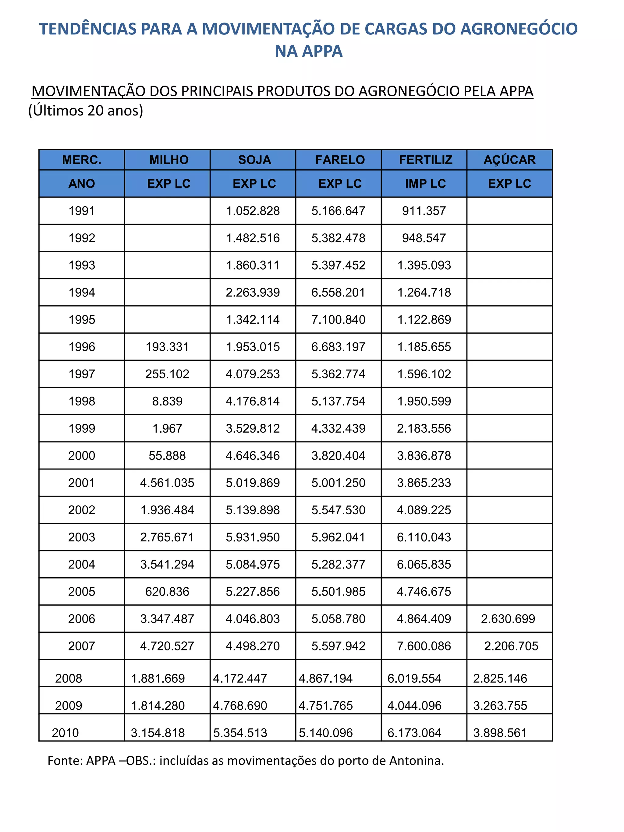 O documento analisa as tendências de movimentação de cargas do agronegócio no porto de Paranaguá nos últimos 20 anos. A produção de soja e milho no Paraná vem crescendo constantemente, com exceção de alguns anos com quebras de safra por questões climáticas. A soja em particular deve continuar sendo o principal produto exportado pelo estado, apesar de desafios como custos de produção crescentes e limitação na expansão de áreas plantadas. O porto de Paranaguá deve manter os volumes de soja exportados nos próximos
