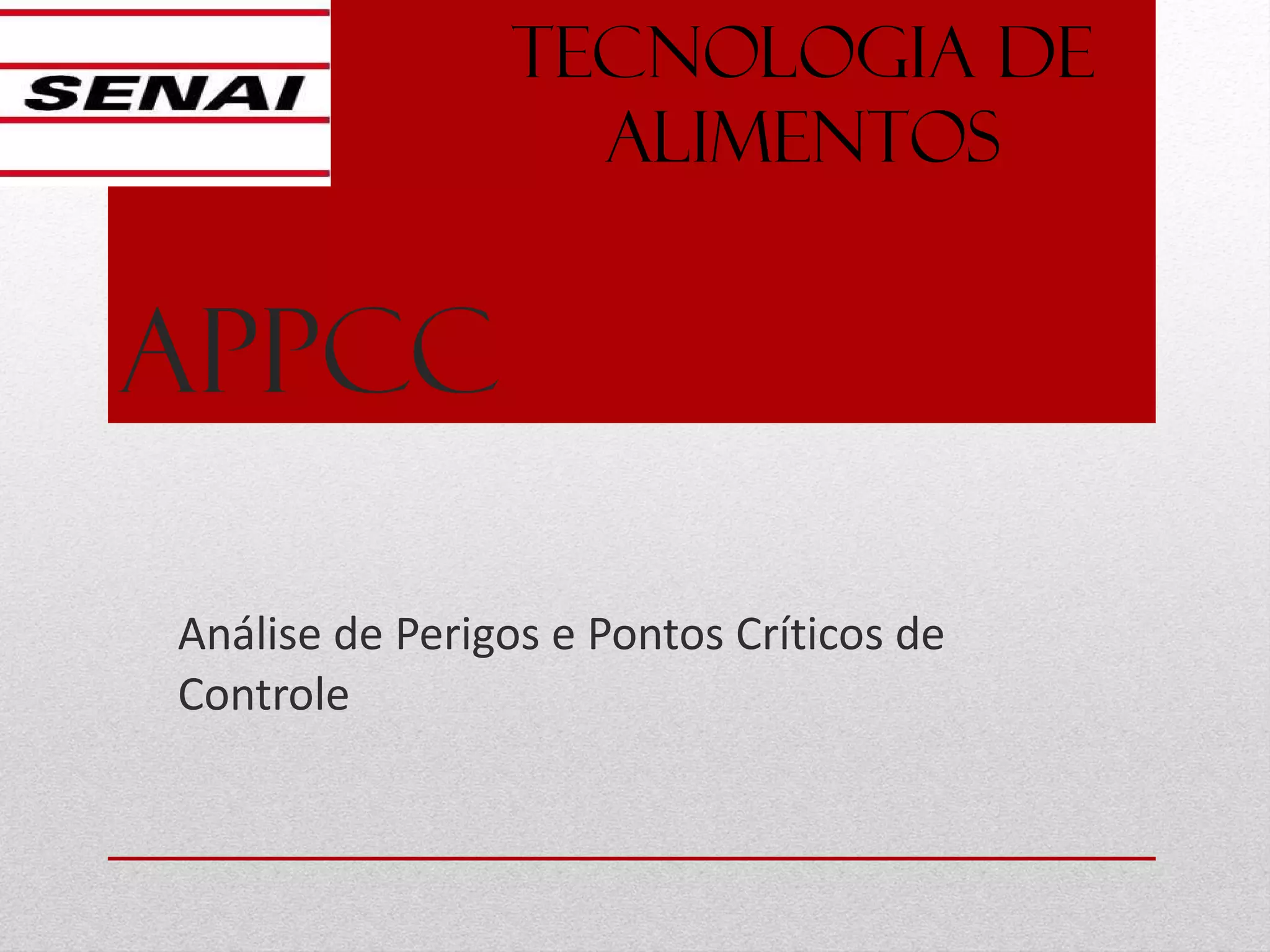 O documento introduz o sistema APPCC (Análise de Perigos e Pontos Críticos de Controle), usado na indústria de alimentos para identificar e controlar perigos. Ele explica que o sistema garante a segurança dos alimentos e traz benefícios como redução de custos. Também descreve os principais perigos na indústria de alimentos e como o sistema APPCC é organizado em uma empresa, com destaque para a importância da monitoração dos Pontos Críticos de Controle.