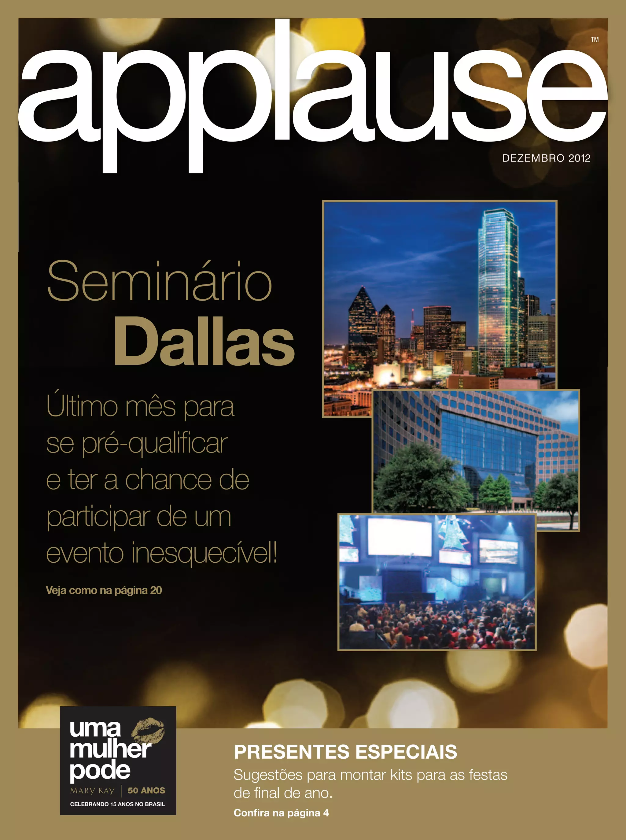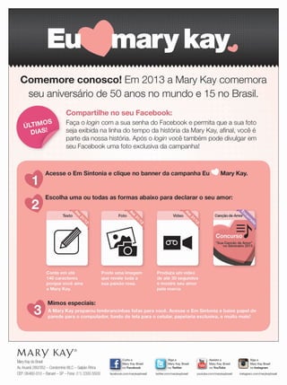 O documento discute o ano de 2012 da Mary Kay no Brasil, parabenizando as consultoras e diretoras pelos recordes batidos. Também anuncia o 50o aniversário da empresa em 2013 e 15 anos da Mary Kay no Brasil, convidando para sonhar alto. Oferece orientações online sobre carreira e produtos, e dicas de presentes para as festas de fim de ano.