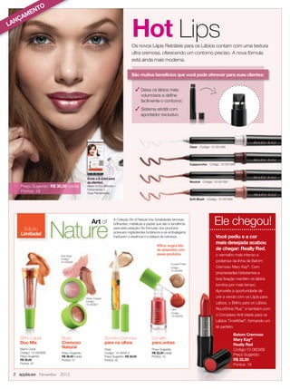 O documento apresenta novos produtos da linha Mary Kay, incluindo lápis para lábios e olhos, sombras, blushes e esmaltes. Sugere kits de presente com os produtos, destacando a nova cor de batom Really Red e uma maquiagem inspirada no olhar de gato.