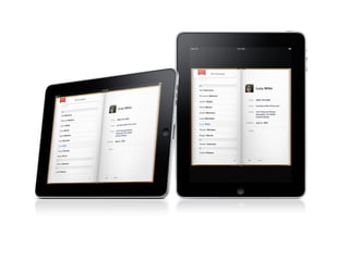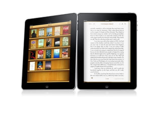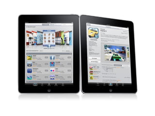 O documento descreve o lançamento do iPad pela Apple em 27 de janeiro de 2009, detalhando suas principais especificações técnicas, como o processador Apple A4, tela touchscreen de 9,7 polegadas e sistema operacional baseado no iPhone OS. Também menciona seus preços inicias entre US$ 499 e US$ 829 dependendo da capacidade e modelo, com ou sem conexão 3G.