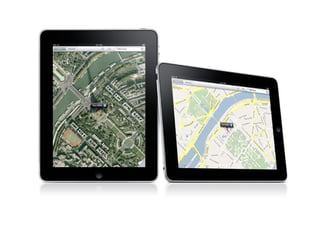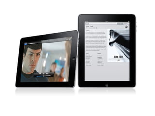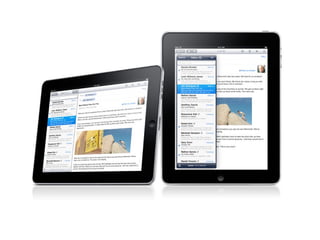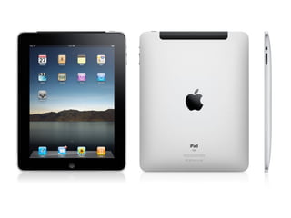 O documento descreve o lançamento do iPad pela Apple em 27 de janeiro de 2009, detalhando suas principais especificações técnicas, como tela de 9,7 polegadas, processador A4 e armazenamento de 16 a 64GB, além de preços entre US$ 499 e US$ 829 dependendo do modelo. Apresenta também algumas limitações do iPad em relação a câmera, compatibilidade com Flash e multitarefa.