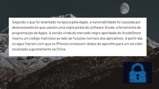 O documento oferece uma visão geral da história da Apple, detalhando o desenvolvimento de seus sistemas operacionais desde a fundação em 1976 até o macOS atual, incluindo suas atualizações e melhorias ao longo dos anos. Também aborda a arquitetura do sistema, gestão de memória e comparação entre macOS e Windows, destacando vantagens e desvantagens. Por fim, menciona recursos do sistema de arquivos HFS+ e APFS, além de referências para mais informações.