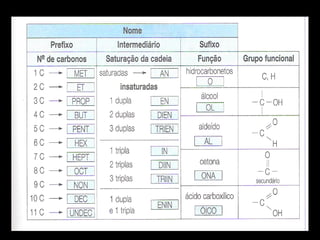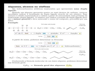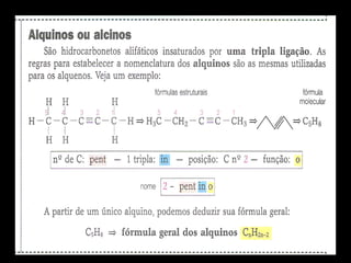Este documento descreve os principais tipos de hidrocarbonetos, incluindo suas estruturas e nomenclaturas. Os hidrocarbonetos são divididos em alifáticos e cíclicos. Os alifáticos incluem alcanos (cadeias com ligações simples), alquenos (cadeias com dupla ligação), alquinos (cadeias com tripla ligação) e alcadienos (cadeias com duas duplas ligações). Os cíclicos incluem cicloalcanos (anéis com ligações simples