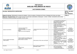 O documento apresenta uma análise preliminar de riscos para serviços de carpintaria em uma usina hidrelétrica, identificando eventos indesejáveis, causas, efeitos e ações preventivas para riscos como acidentes de trânsito, quedas, contato com ferramentas cortantes, ruído, animais peçonhentos e armazenamento inadequado de materiais.