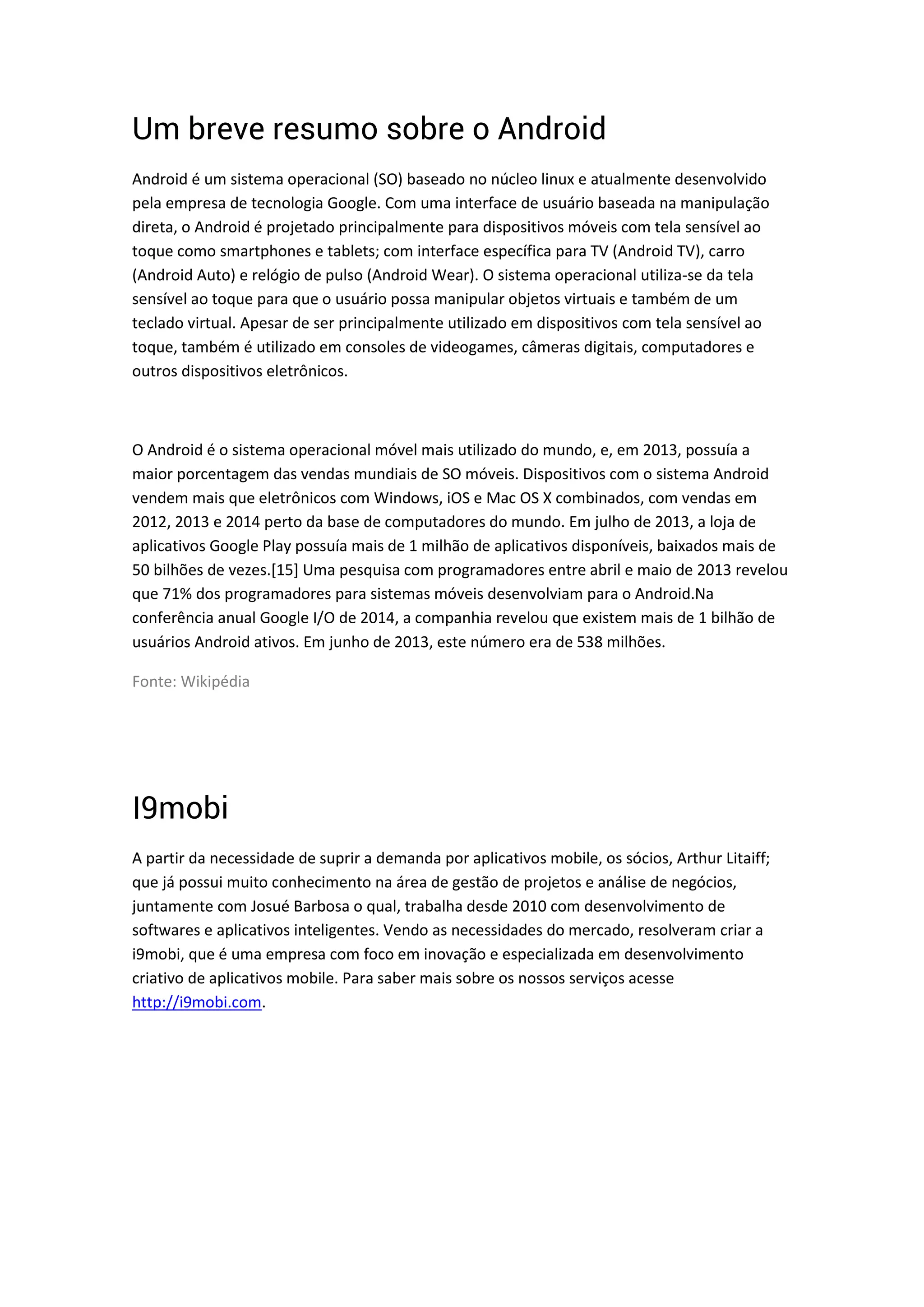 O documento apresenta um breve resumo sobre o sistema operacional Android: (1) É um sistema operacional baseado no núcleo Linux desenvolvido pela Google para dispositivos móveis com tela sensível ao toque; (2) É o sistema operacional móvel mais utilizado no mundo com mais de 1 bilhão de usuários ativos em 2014; (3) Além de smartphones e tablets, também é utilizado em outros dispositivos como TVs, carros e relógios.