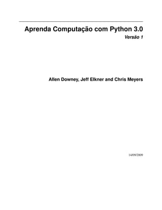 Este livro introduz a linguagem de programação Python para iniciantes. Ele cobre tópicos como variáveis, tipos, funções, condicionais, recursividade, iteração e strings. O livro é dividido em capítulos focados em diferentes conceitos de programação e inclui exemplos e glossários no final de cada capítulo.