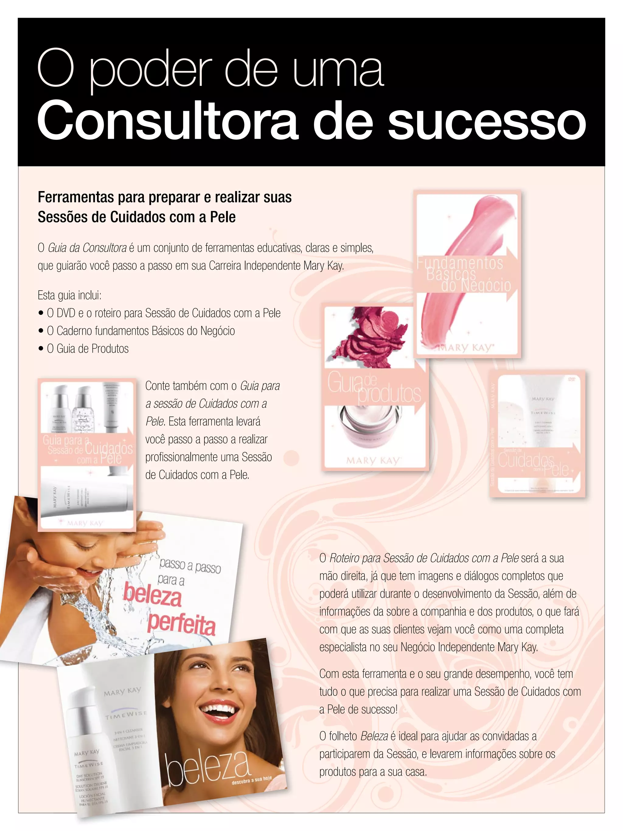 Este documento descreve as ferramentas fornecidas para consultoras de beleza da Mary Kay, incluindo um DVD, guias de produtos e sessões, e folhetos para anfitriãs e clientes, para auxiliar no sucesso das consultorias e vendas de produtos.
