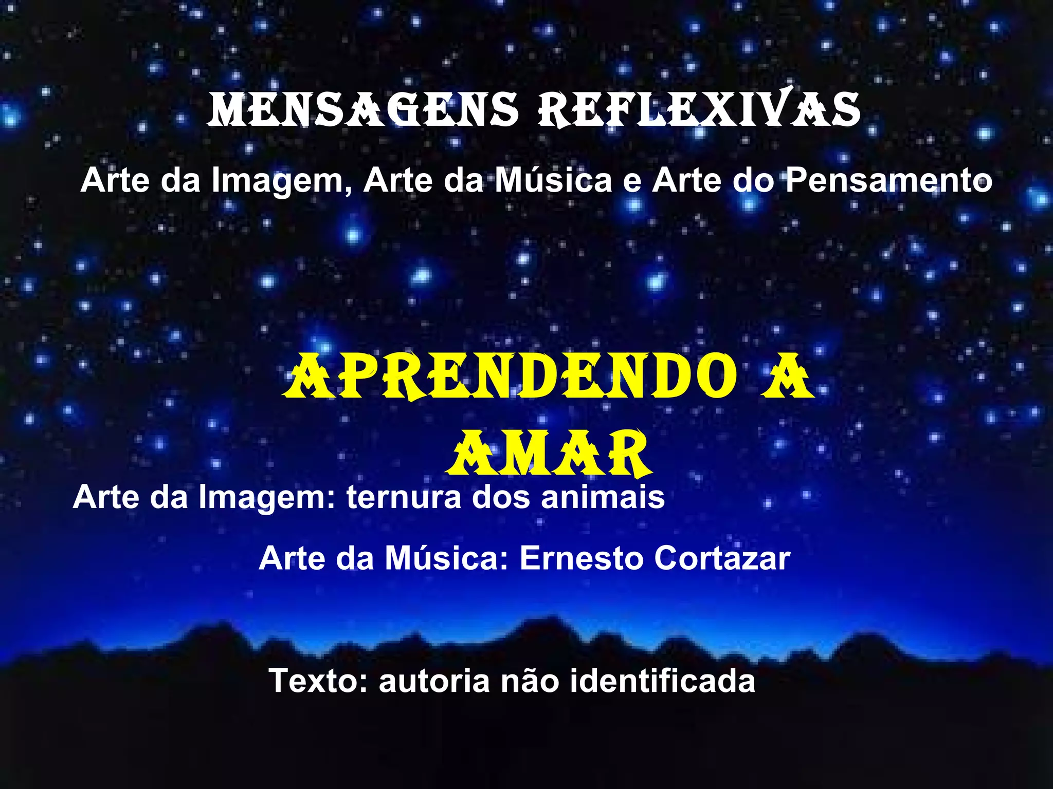 Este documento discute a arte da imagem, música e pensamento. Ele enfatiza que o amor é a força motriz da vida e que precisamos aprender a amar uns aos outros, aceitando nossas diferenças. O texto também reflete sobre o processo lento, mas importante, de aprender a amar e perdoar.
