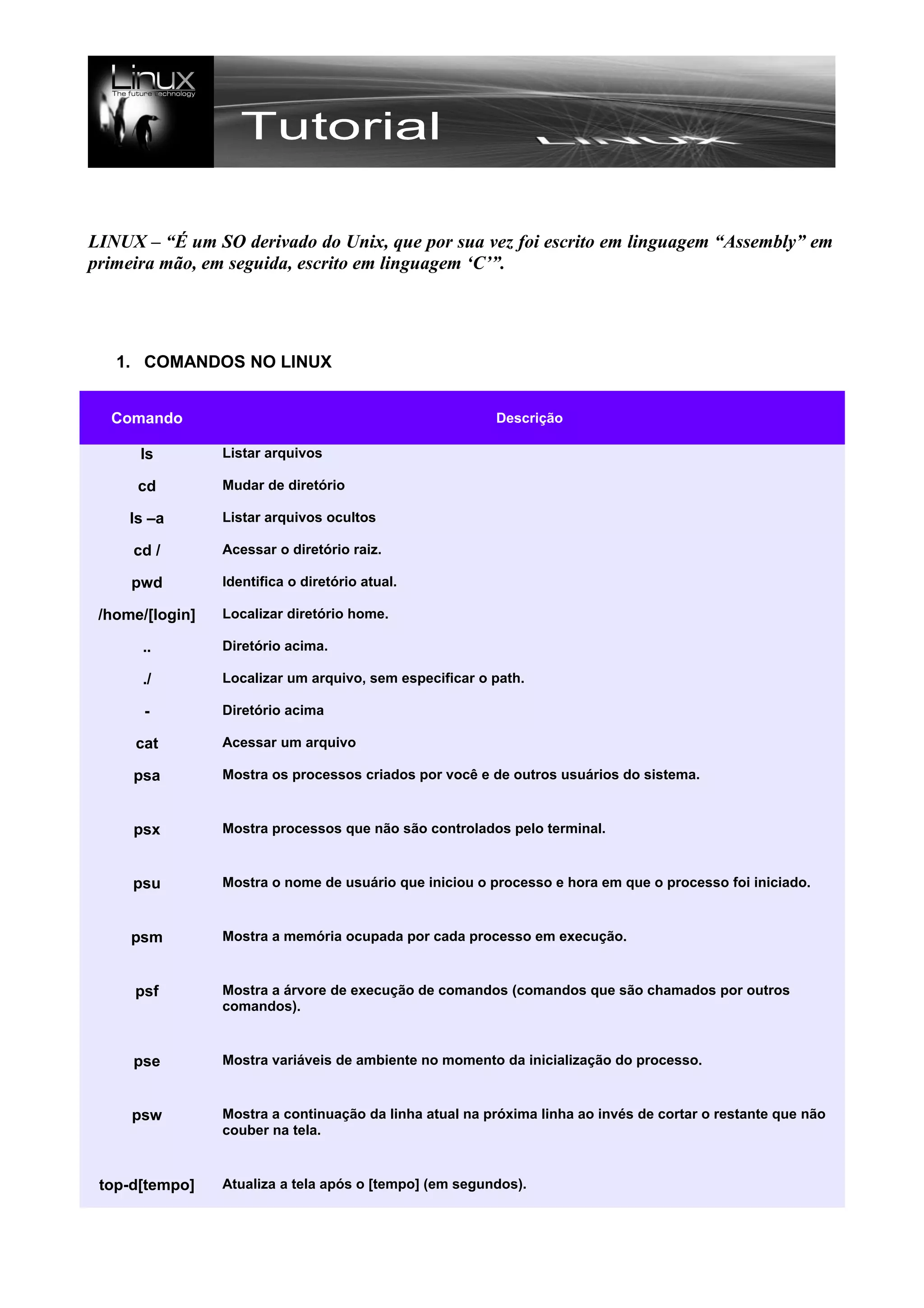Este documento fornece uma introdução aos principais comandos e conceitos do sistema operacional Linux, incluindo: 1) comandos básicos para navegação e gerenciamento de arquivos e processos, 2) estrutura de diretórios padrão, 3) definições de termos importantes como compilação, foreground e background, e 4) controle de execução de processos.