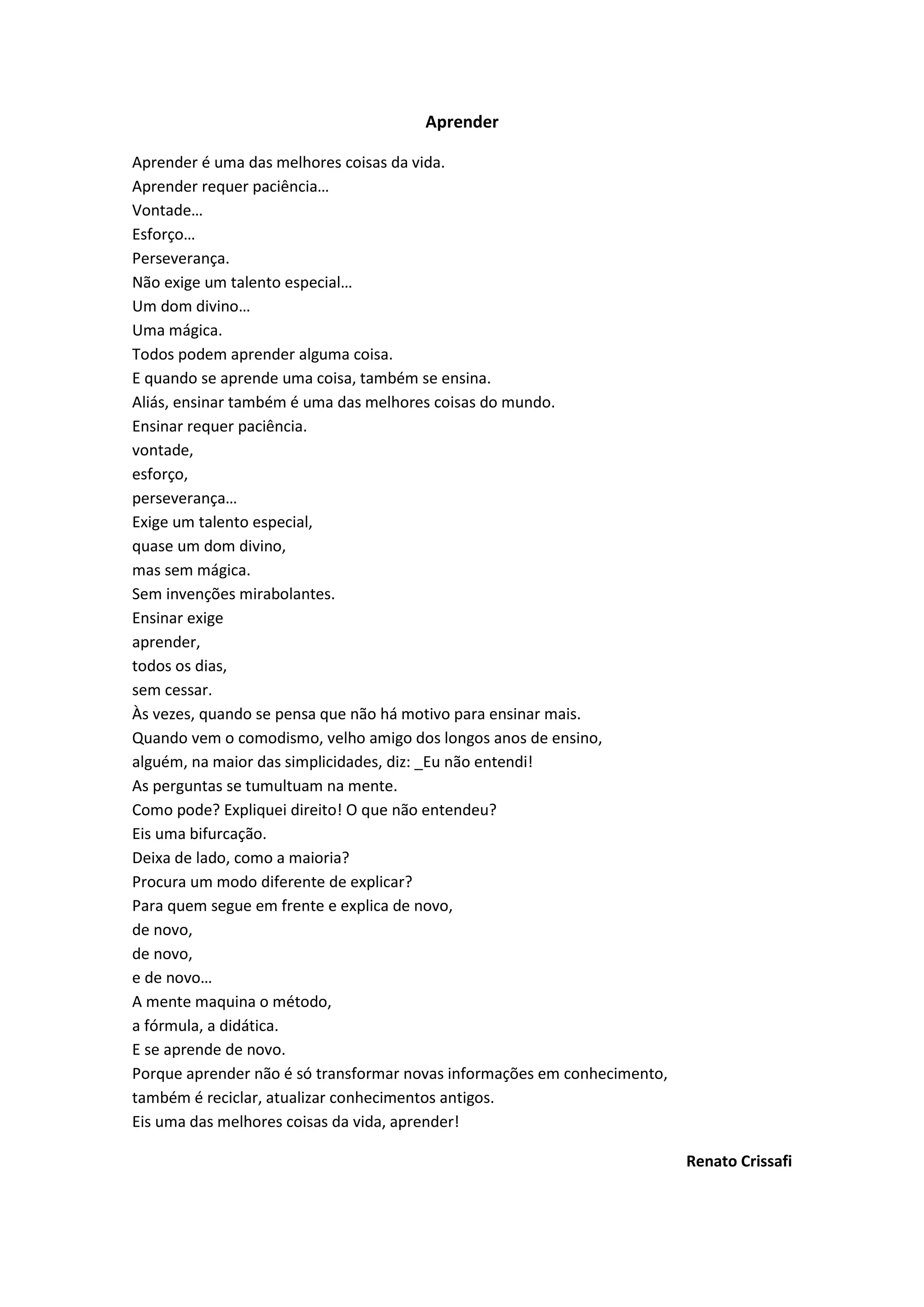 Aprender requer esforço, perseverança e não tem limites. Ensinar também exige esforço contínuo, paciência e estar disposto a aprender novamente para encontrar novas formas de explicar quando os alunos não compreendem. Aprender e ensinar são processos que se alimentam mutuamente e são gratificantes.