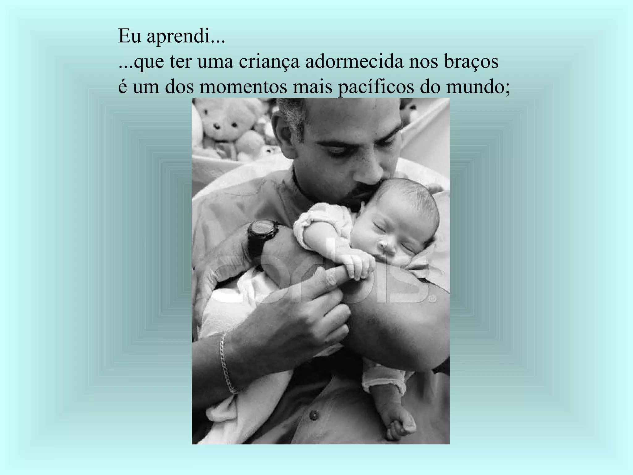 Eu aprendi... ...queninguém é perfeito até que você se apaixone por essa pessoa; Eu aprendi... ...que a vida é dura, mas eu sou mais ainda; Eu aprendi... ...que as oportunidades nunca são perdidas; alguém vai aproveitar as que você perdeu. Eu aprendi... ...que quando o ancoradouro se torna amargo a felicidade vai aportar em outro lugar; Eu aprendi... ...que devemos sempre ter palavras doces e gentis pois amanhã talvez tenhamos que engoli-las;