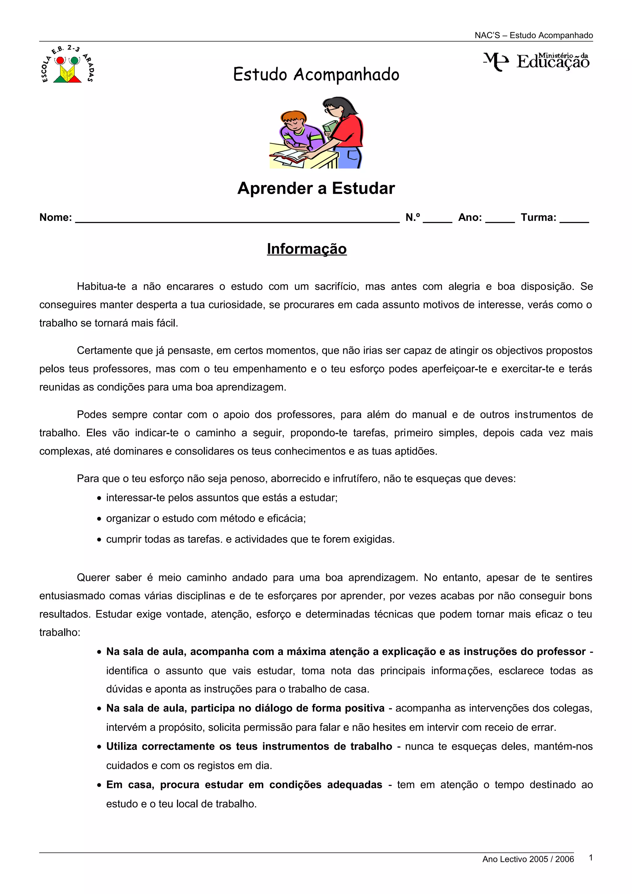 Este documento fornece orientações sobre como estudar de forma eficaz. Ele discute a importância de manter uma atitude positiva em relação ao estudo, de se organizar com método e cumprir as tarefas atribuídas. Também fornece dicas como prestar atenção em aula, tirar notas, estudar em local adequado e preparar-se adequadamente para os testes. Inclui ainda uma grelha para a avaliação dos próprios hábitos de estudo.