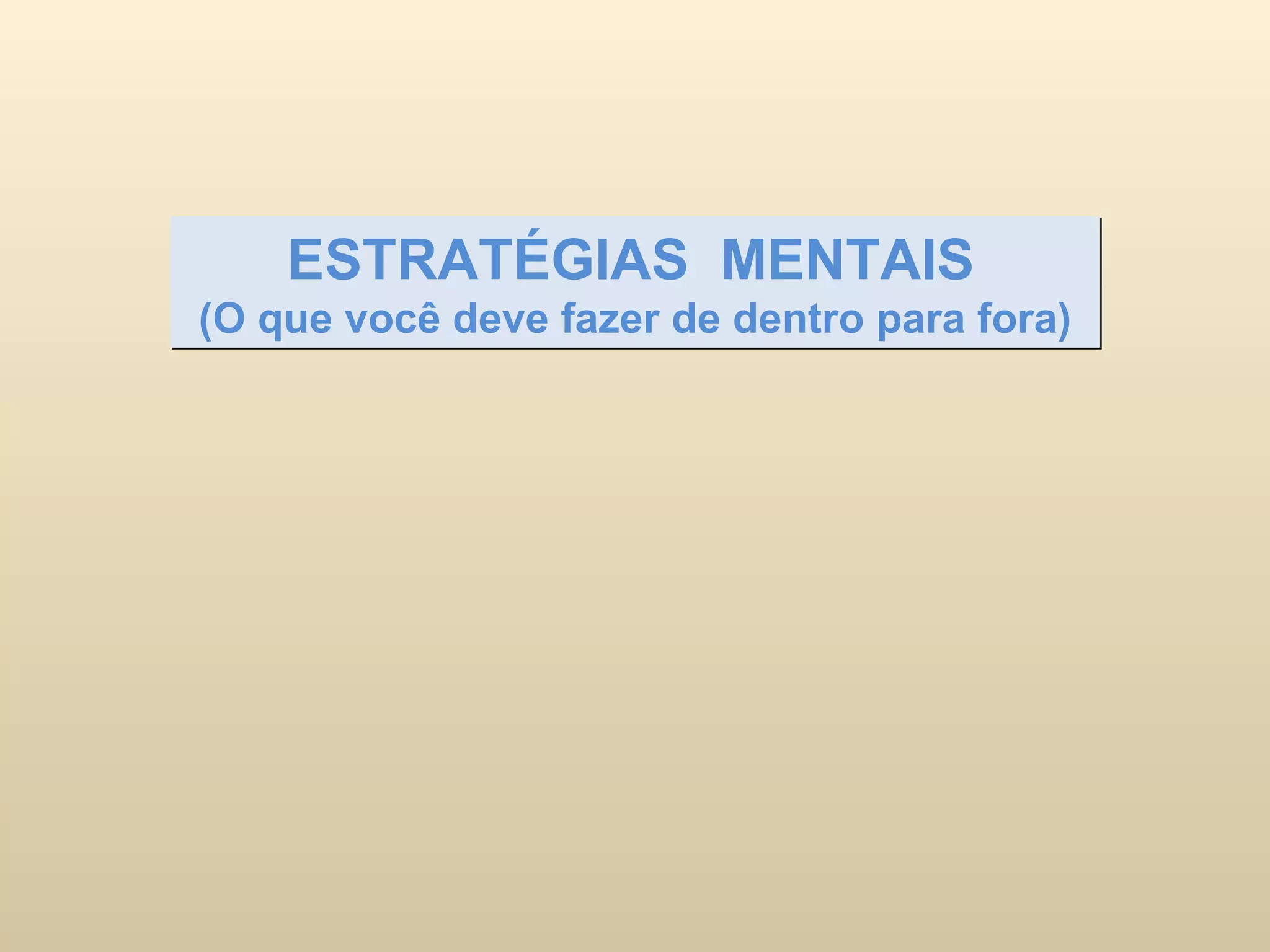 O documento fornece estratégias mentais positivas para pensar de forma positiva, não ter medo, não reclamar, não se culpar, ignorar interferências externas, não se irritar facilmente e viver no presente. Também fornece estratégias externas como contato com a água, natureza e música para libertar a mente da rotina e viver plenamente.