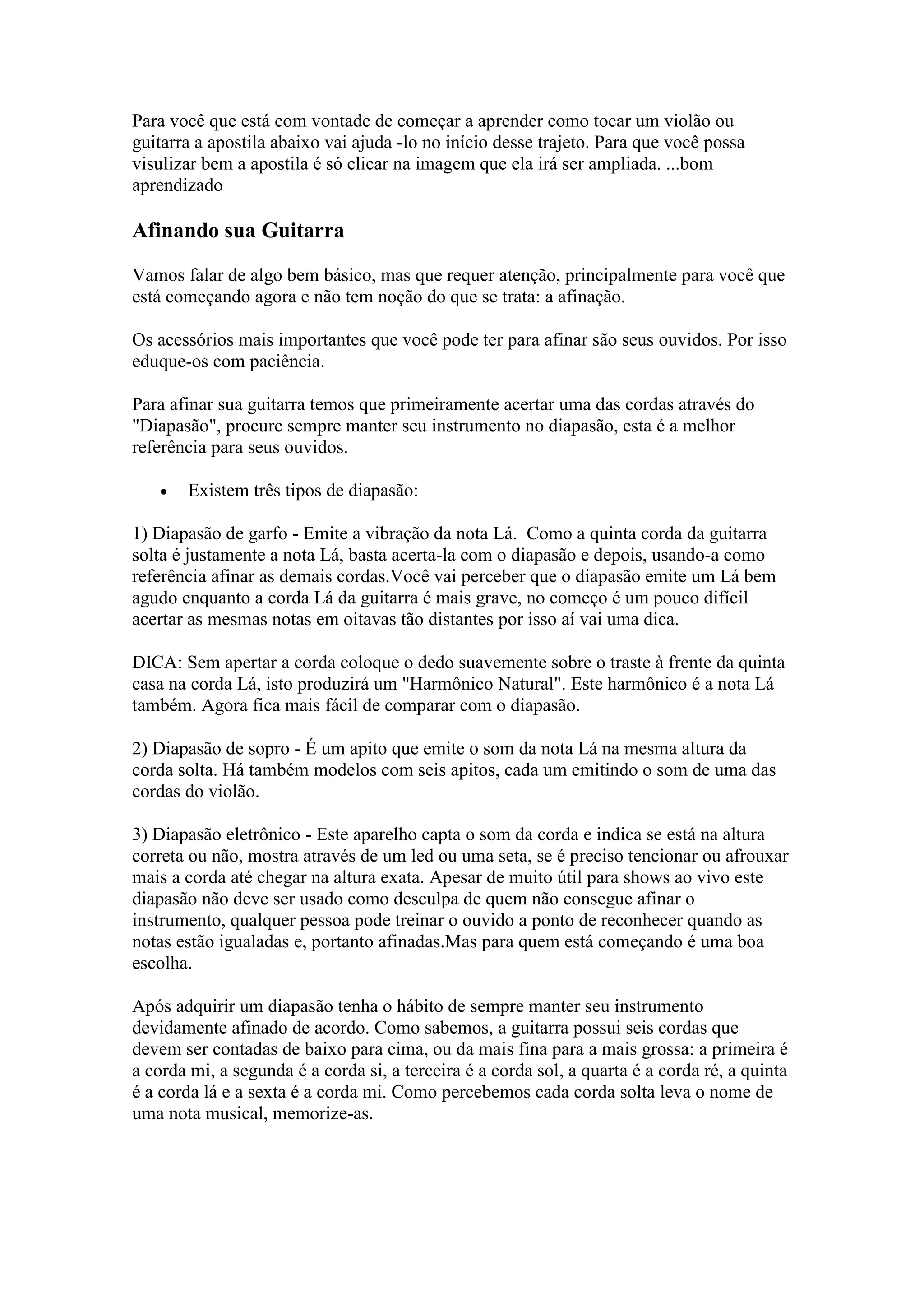O documento fornece instruções básicas sobre como afinar uma guitarra ou violão, incluindo os tipos de diapasões, como igualar as notas das cordas e a anatomia do instrumento. Explica como posicionar as mãos e ler cifras musicais.