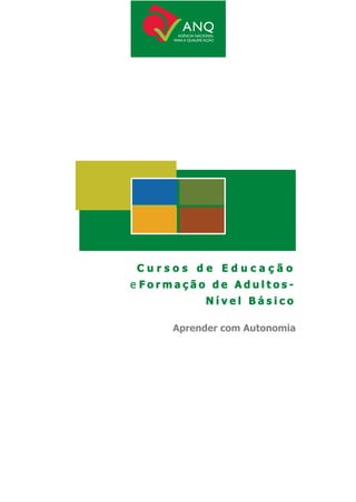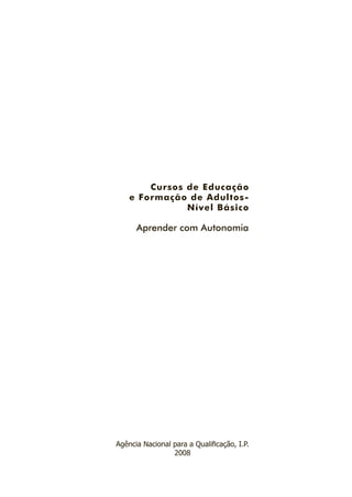 O documento apresenta o módulo 'aprender com autonomia' destinado aos cursos de educação e formação de adultos de nível básico, com o objetivo de integrar e qualificar adultos que abandonaram a escola. Ele estrutura-se em fundamentação, objetivos, orientações metodológicas e avaliação, enfatizando a importância da participação ativa dos formandos na construção do seu aprendizado. As atividades sugeridas buscam promover a inclusão, a cooperação e o desenvolvimento de competências pessoais e sociais para uma vida profissional mais qualificada.