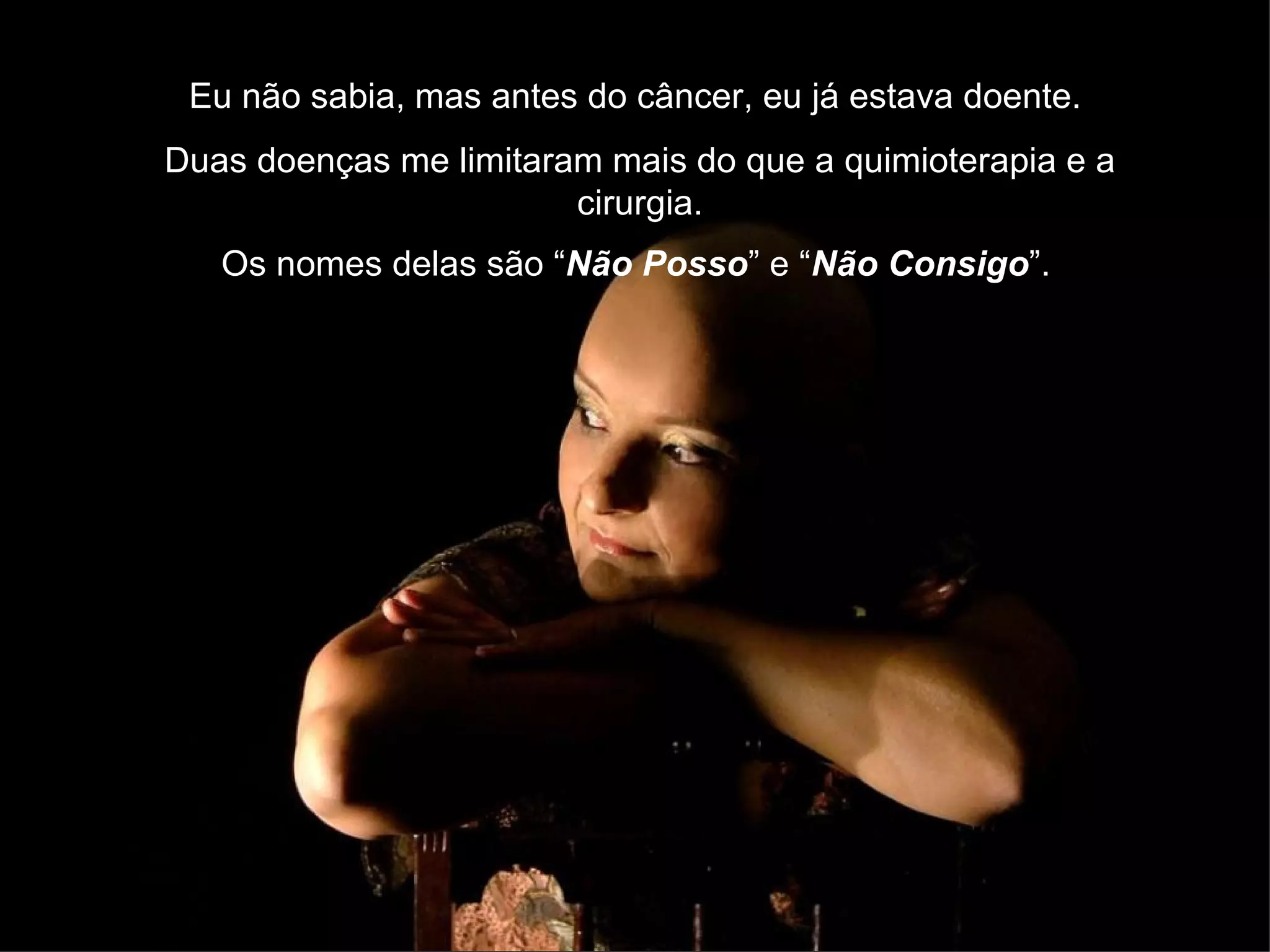 A autora sofria de baixa autoestima e se limitava por medo de críticas, mas depois de enfrentar o câncer aprendeu a se aceitar e valorizar sua beleza interior em vez de se preocupar com aparências. Ela descobriu que a doença pode matar preconceitos e medos, permitindo que as pessoas apreciem mais a vida.