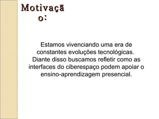 O documento apresenta o projeto "Aprendiz Online", um fórum virtual de aprendizagem cooperativa. Seu objetivo é analisar as potencialidades de uma extensão virtual para apoiar o ensino presencial, apresentando a experiência do fórum como extensão da sala de aula. A metodologia é qualitativa e baseada no estudo de caso dos participantes do fórum.