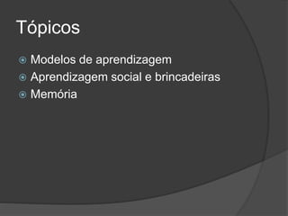 O documento discute diversos modelos de aprendizagem em animais, incluindo aprendizado social, condicionamento clássico e operante, e as diferentes memórias envolvidas. Destaca como a experiência molda o comportamento e a importância da memória para melhorar o sucesso futuro dos indivíduos. A aprendizagem é apresentada como um processo complexo e adaptável, com limitações biológicas que influenciam suas capacidades.