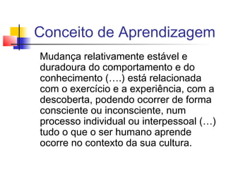 O documento descreve as principais teorias da aprendizagem, incluindo o condicionamento clássico de Ivan Pavlov, o condicionamento operante de Thorndike, a teoria behaviorista de Skinner, a aprendizagem social de Albert Bandura e as teorias cognitivas de Piaget e Bruner. Também discute fatores que facilitam a aprendizagem como motivação, feedback e estruturação.