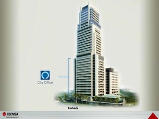 O documento apresenta informações sobre o empreendimento imobiliário City Centro Cívico em Curitiba, que inclui torres residenciais e corporativas. Com 390 unidades, o projeto oferece diversas opções de moradia e escritórios, além de áreas comuns e lazer. A estrutura conta com elevadores, estacionamento e certificação LEED, destacando-se pelo design e funcionalidade.