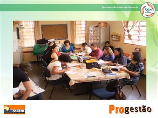 O documento discute como promover a gestão democrática e participação na escola pública. Ele explica a importância de envolver a comunidade escolar nas decisões e atividades da escola para fortalecer o comprometimento e contribuir para a formação dos cidadãos. Também fornece diretrizes para descentralizar o poder e compartilhá-lo através da participação nas discussões e organização das atividades escolares.