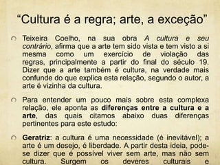 O documento discute as relações entre cultura e arte, definindo arte como uma exceção à regra da cultura. Também apresenta as políticas culturais brasileiras ao longo da história, destacando instituições como a Funarte, IPHAN e programas como Cultura Viva e Mais Cultura. Por fim, descreve algumas instituições culturais da cidade de São Paulo.