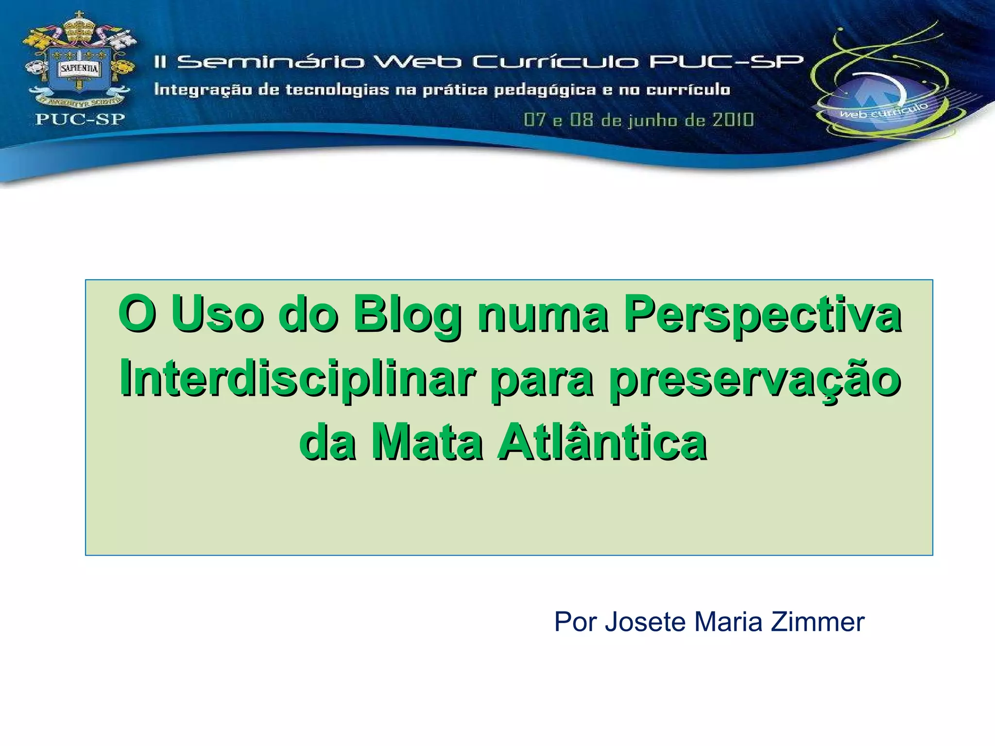 O documento discute o uso de blogs em uma perspectiva interdisciplinar para preservar a Mata Atlântica. Os alunos aprenderam a escrever, pesquisar online, construir blogs e publicar conteúdo para ajudar no meio ambiente. O projeto mostrou que a informática educacional pode promover transformações positivas quando bem utilizada.