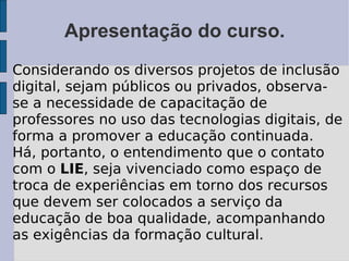 Este curso introdutório à educação digital tem como objetivo capacitar professores no uso de ferramentas digitais para promover a educação continuada. O curso aborda temas como navegação na internet, comunicação online, elaboração de textos e apresentações, além de introduzir softwares livres e seu uso em projetos educacionais.