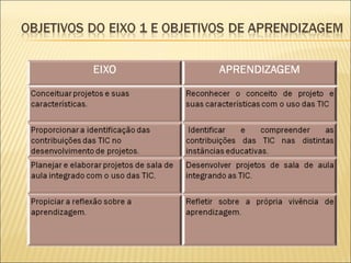 O curso tem como objetivo desenvolver atividades que integram as dimensões teóricas, metodológicas e práticas para que professores e gestores escolares possam identificar as contribuições das TIC ao desenvolvimento de projetos de sala de aula e planejar e desenvolver o Projeto Integrado de Tecnologias no Currículo.